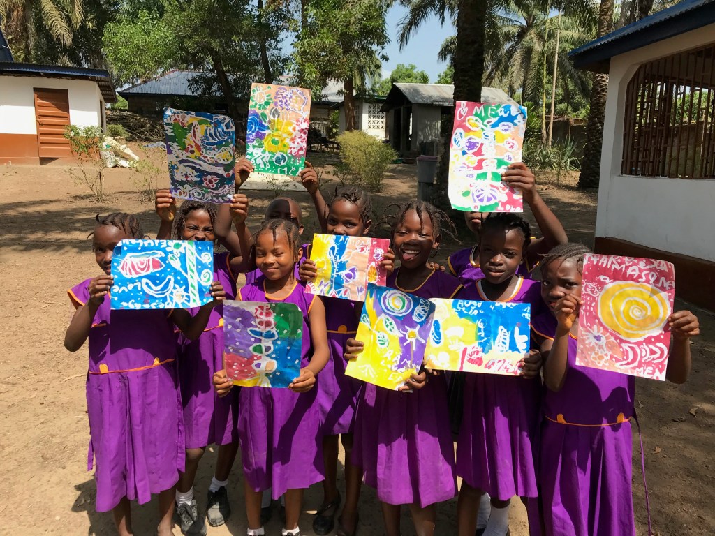 Nous sommes arrivés les bras chargés de peinture, d’encres colorées, de néocolors et de feutres pour faire découvrir aux écolières la joie des activités créatrices. Vive les couleurs. Les enseignants étaient tout aussi émerveillés. Une étagère de matériel créatif et a été mise en place.